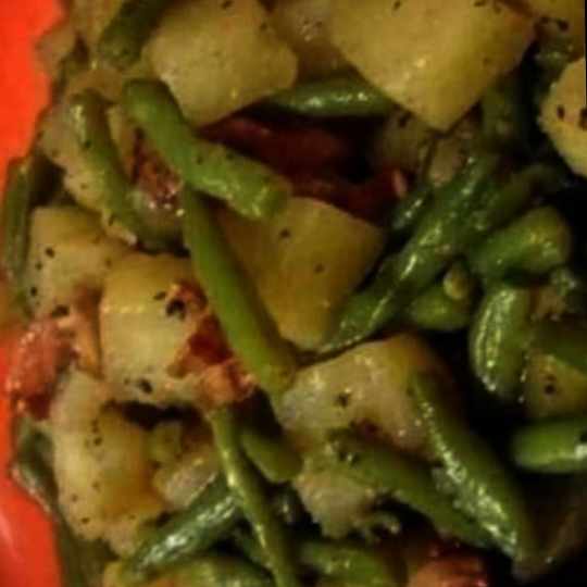 2. Mix, then add the bacon bits. Leave to brown for a few moments before adding the flat beans and sprinkle with chopped parsley.