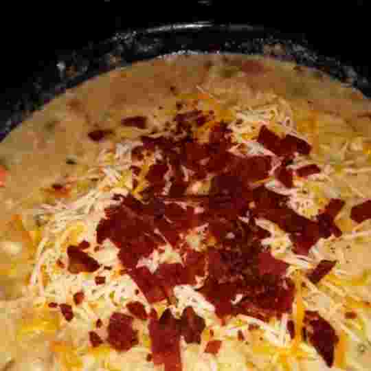 • Stir the thickened milk into the crockpot, along with 1 cup of cheese, and most of the cooked, chopped bacon (reserving some for topping).