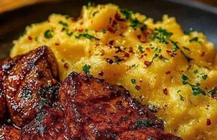 Serve the steak bites on top of the cheesy smashed potatoes and drizzle extra garlic butter from the pan over everything. Add a side of steamed green beans or asparagus for a complete meal.