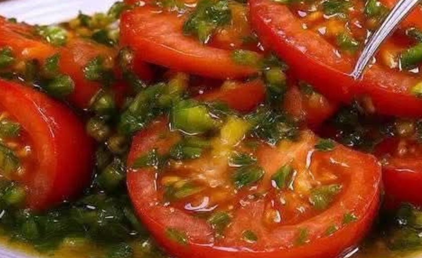 IngredientsFOR THE SALAD:800–900 grams of ripe, juicy tomatoes (choose a mix of heirloom, cherry, or vine-ripened tomatoes for variety)1 bell pepper (red or yellow, finely chopped)A bunch of fresh dill and parsley , finely choppedFOR THE MAGIC DRESSING:50 ml extra virgin olive oil25 ml red wine vinegar30 ml water1 teaspoon salt (adjust to taste)3 teaspoons sugar½ tablespoon sweet paprika ️5 garlic cloves , mincedOptional Additions:Fresh chili or cayenne pepper for a spicy kick InstructionsStep 1: Prepare the TomatoesWash the tomatoes thoroughly and pat them dry.Cut them into slices, wedges, or bite-sized pieces, depending on your preference. Arrange them in a large mixing bowl or serving dish.Step 2: Make the Magic DressingIn a small bowl, whisk together the extra virgin olive oil , red wine vinegar , water , salt , sugar , sweet paprika , and minced garlic .Taste and adjust the seasoning if needed. For a spicier twist, add a pinch of cayenne pepper or finely chopped fresh chili.Step 3: Add a Pop of ColorFinely chop the bell pepper and stir it into the dressing. This adds a touch of sweetness, crunch, and vibrant color to the salad.Step 4: Combine the FlavorsPour the dressing over the prepared tomatoes. Gently toss the salad to ensure all the ingredients are evenly coated with the dressing. Be careful not to crush the tomatoes while mixing.Step 5: Add the Final TouchSprinkle the chopped dill and parsley over the top of the salad for a burst of freshness and aroma.Step 6: Let the Magic HappenCover the salad and refrigerate for at least 30 minutes before serving. This allows the flavors to meld together and intensify, creating a truly magical experience.Step 7: Serve and EnjoyServe the salad chilled as a side dish with grilled meats, fish, or pasta, or enjoy it as a light main course on a hot day.Tips for SuccessTomato Selection: Use the ripest, juiciest tomatoes you can find for the best flavor. A mix of colors and varieties adds visual appeal.Herb Substitutions: If you don’t have dill or parsley, try basil, cilantro, or mint for a different twist.Make Ahead: This salad tastes even better the next day as the flavors continue to develop. Store it in an airtight container in the refrigerator for up to 2 days .Customize It: Add extras like thinly sliced red onion, cucumber, or olives for more texture and flavor.Why You’ll Love This RecipeThis Magic Tomato Salad is a celebration of simplicity and flavor. The combination of juicy tomatoes, tangy-sweet dressing, and fresh herbs creates a symphony of tastes that’s both refreshing and satisfying. Whether you’re serving it alongside a hearty meal or enjoying it as a standalone dish, this salad is a guaranteed crowd-pleaser. Its vibrant colors and bold flavors make it a standout on any table. Dive into this explosion of freshness and let it become a staple in your kitchen!TimePreparation Time: 15 minutesChilling Time: 30 minutesTotal Time: ~45 minutesServings:4–6 servingsCalories (Approximate):~150 kcal per serving (varies based on portion size and optional additions)Enjoy!